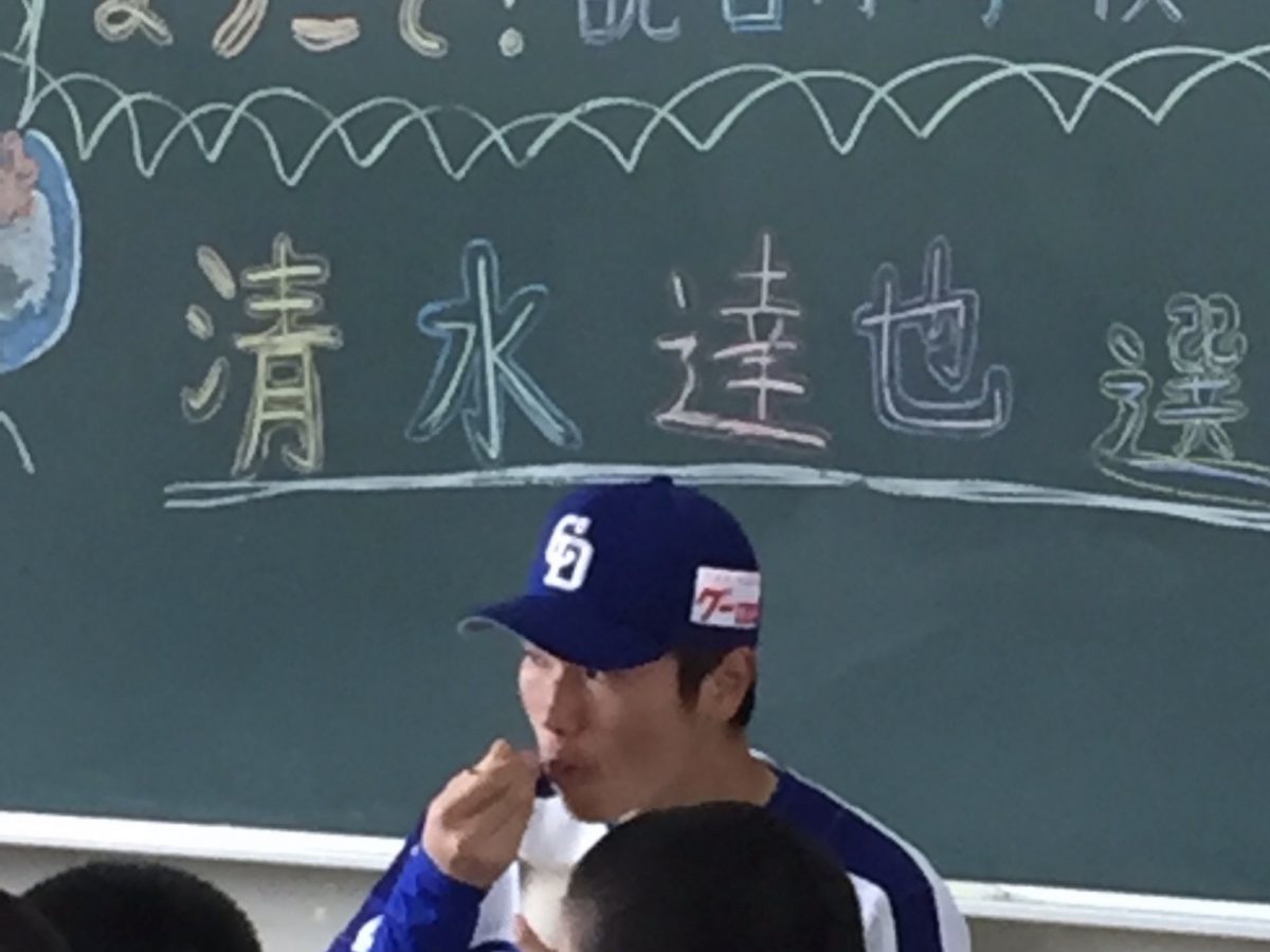 清水投手は、高校野球時代に2回、こういう給食体験をやっていたので、今回が3回目。さすがに苦手な食べ物の話はせずに切り抜けたようです。それでも最後に質問コーナーがあり、そこで年俸の額を聞かれるなど容赦ない質問にあい、タジタジになっていました。