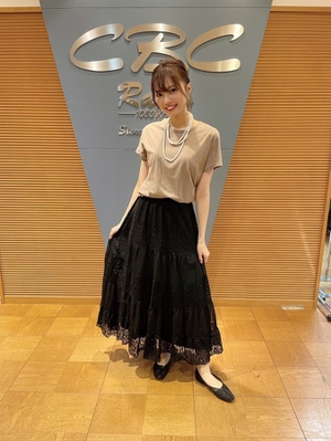 ベージュ系Tシャツと黒レースのロングスカートを合わせて♪