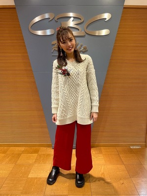 ざっくり編みのホワイトニットが赤いパンツに映える( *´艸`)