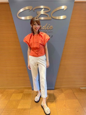 オレンジのトップスに、