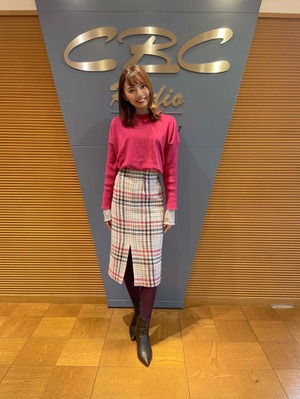 鮮やかピンクニットにチェックスカートを合わせて♪