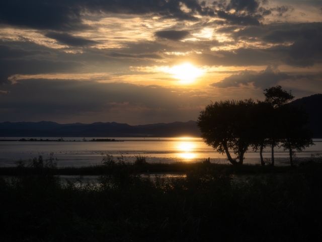 湖畔の豊かな自然の中で水鳥たちが戯れる様子を観察できるだけでなく、透明度の高いびわ湖に沈む夕日も見どころ。