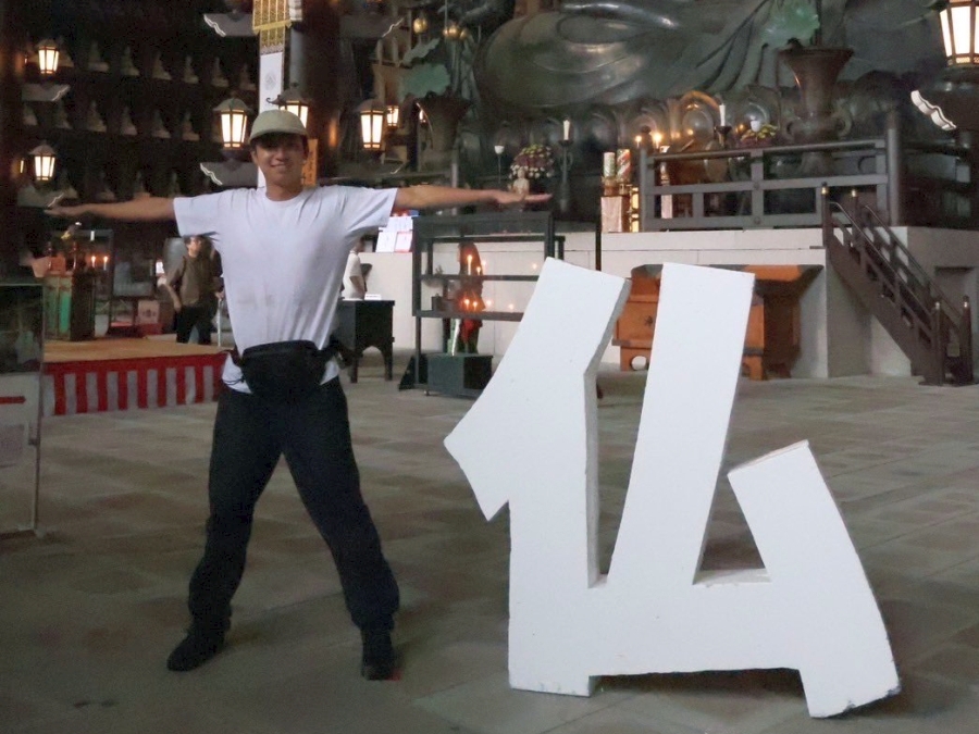 大仏殿の中に、高さ160センチほどの「仏」の字をかたどったパネルが置いてあり、その左隣に両手両足を広げて「大」の字になって立てば、仏をバックにベストショットが撮れるそうです。