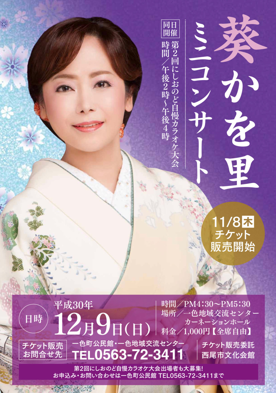 そして12月9日(日)は、私の故郷西尾市にある一色地域交流センター(カーネーションホール)にて「葵かを里ミニコンサート」を開催します(午後4時30分~5時30分 入場料1,000円)。