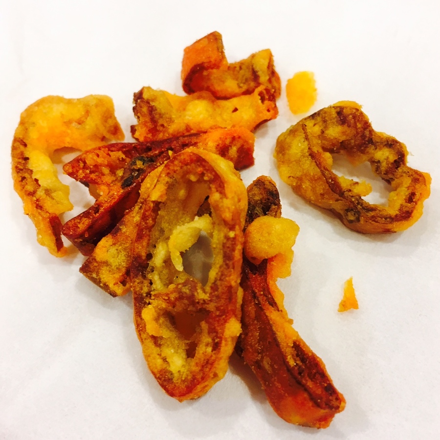 厳選した「唐辛子」を輪切りにし、衣付けして揚げているんです!✨