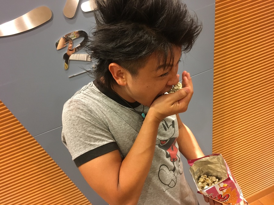 青と白のストライプのジャケットが目印のマイクポップコーン!