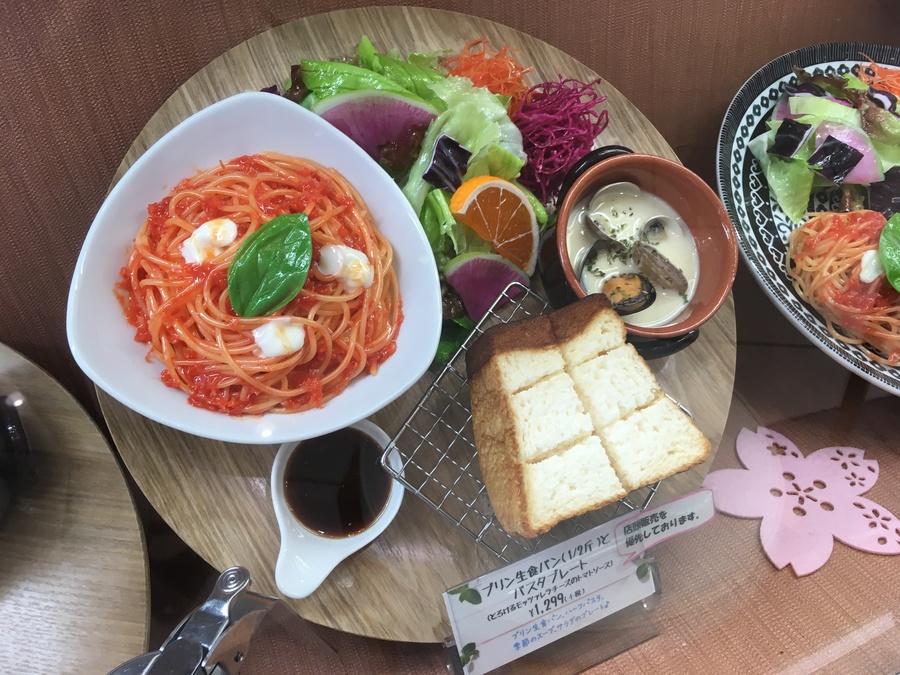 焼き立てのプリン生食パンと一緒にパスタや季節のスープが付いた