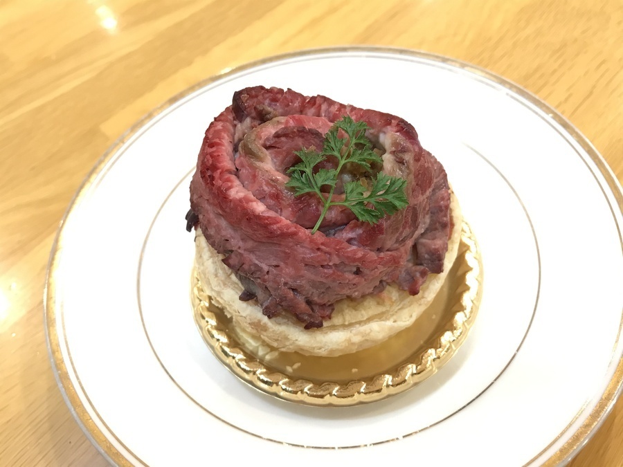 タルトの上には厚めのローストビーフがバラのような形に巻かれていて、とても存在感があります。