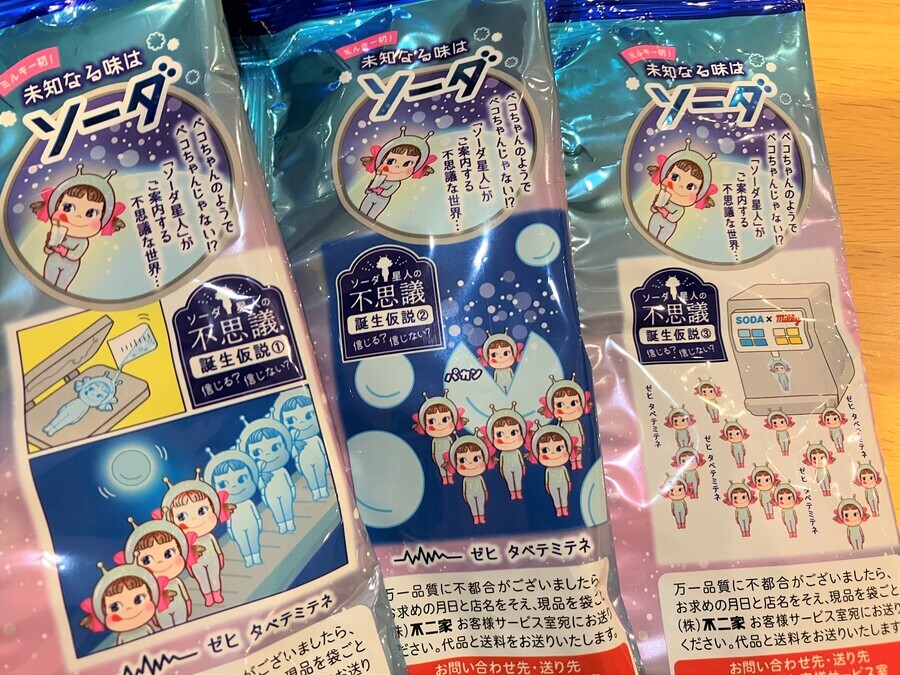 『ソーダミルキー』のパッケージには、「ソーダ味 でました」との文言が。さらに中央には「ソーダ星人」のイラストが。