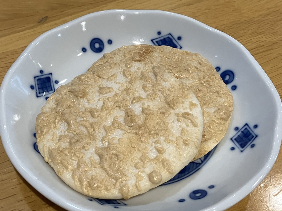 サラダ味のおせんべいに、クリームがまだらにかかっているおなじみの『雪の宿』。