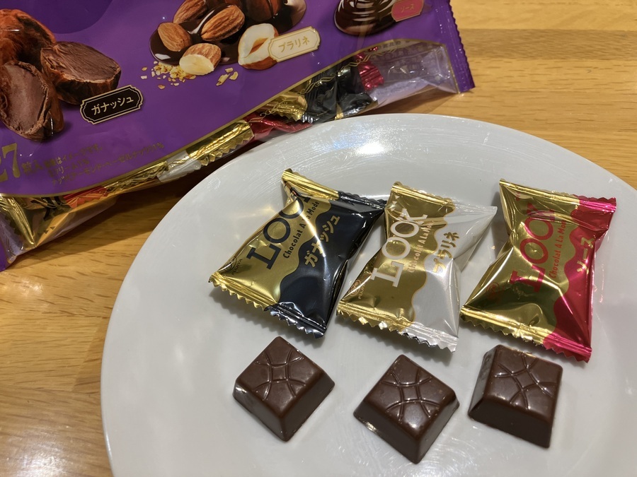 通常は黄色いパッケージに、細長いケースにブロック状のチョコレートが何種類か入っていますが、今回の『LOOK ショコラ・ア・ラ・モード』は個包装27粒入りのファミリーパック。