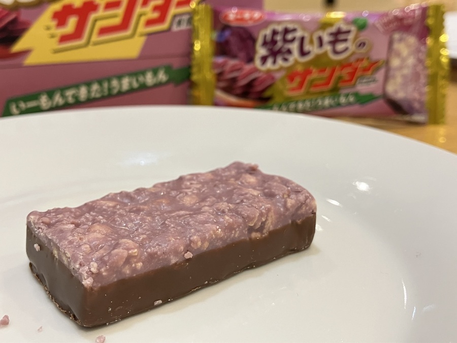 開封すると、紫色と茶色の二層のチョコレートが乗っている構造で「まるで紅芋タルトの雰囲気がある」と清水。