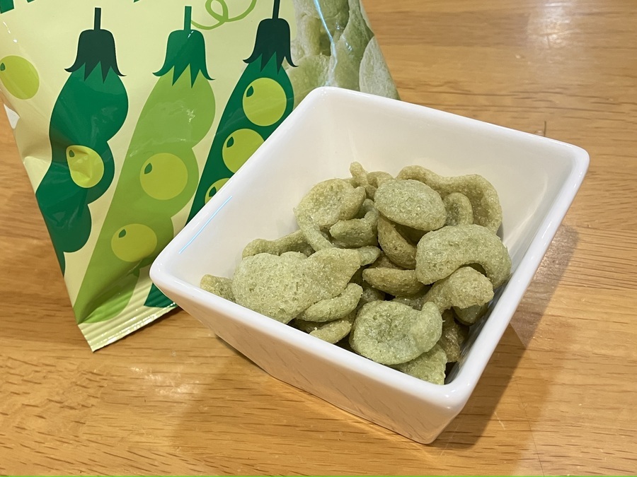 生地にえんどう豆を練り込み、えんどう豆パウダーをまぶしたスナックなのだそう。