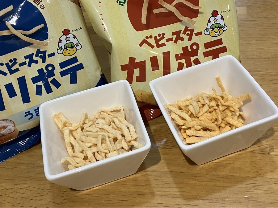 「ベビースター製法でつくった新食感ポテトスナック菓子」とのことで、うましお味とチーズ味の2種類があります。