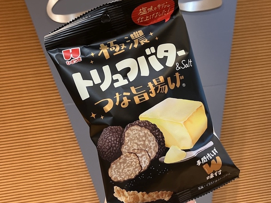 『極濃トリュフバターつな旨揚げ』の販売元はおなじみ、栃木県の「ひざつき製菓」。この番組でも以前『Bリーグチップス』などを取り上げています。