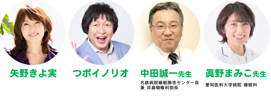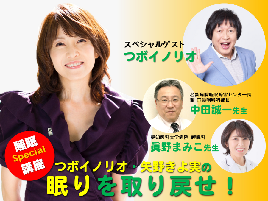 | 出演 | 矢野きよ実(パーソナリティ・書道家) スペシャルゲスト つボイノリオ(CBCラジオパーソナリティ) 講師 中田誠一先生 (名鉄病院睡眠障害センター長 兼 耳鼻咽喉科部長) 眞野まみこ先生 (愛知医科大学病院 睡眠科) ※出演者は予告なく変更となる場合があります。 |