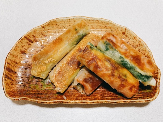 春巻きの皮に、シソ(2枚)をずらして乗せる。