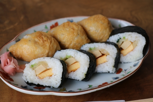 「あげまき」の「あげ」はいなり寿司、「まき」は巻き寿司。それで、いなり寿司と巻き寿司は、洒落をきかせて助六寿司となりました。正確には助六の彼女の寿司ですが。