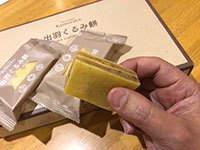 そんな「地元の宝」をいかした一品を作りたい!というところから始まった、「出羽くるみ餅」づくり。ローストした香ばしい月山の天然くるみを求肥餅に練りこみ、これを、バターを溶かした特性のシート(シュークリームのシュー皮のようなもの)を使って、【シート・餅・シート・餅・シート】と何層にも積み上げたミルフィーユに仕上げました。