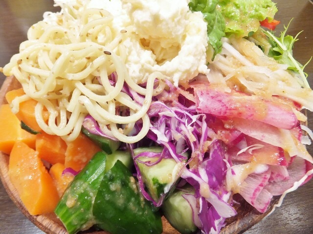 市販のサラダにゆでたパスタを入れて、ドレッシングをかけるだけ。