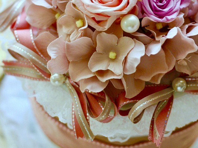 直径15cmはないぐらい、高さも15cmほどの小ぶりのホールケーキを思わせる外観で、上の方はバラの花が所狭しと並んでいます。
