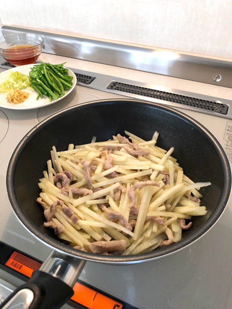 いい香りがしてきたなというところで、一旦移していたお肉とジャガイモをまた戻し、さらにピーマンも入れたら、事前に作ってあった調味料も投入し、5~6回かき混ぜたら完成です。