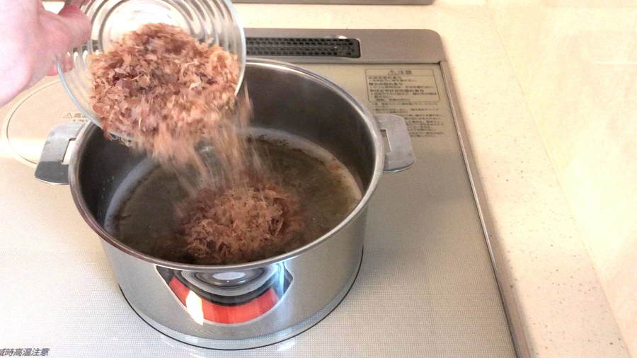 しいたけ味になった戻し汁を沸騰させて、そこに削り節をバサッと入れて火を止めます。そして、そのまま20分おいてから濾します。