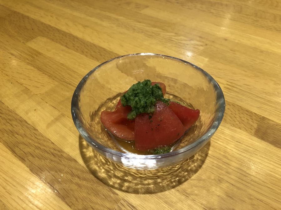 ①:トマトは湯剥きにして種を取り、大きめに切り分け、冷やしておく。