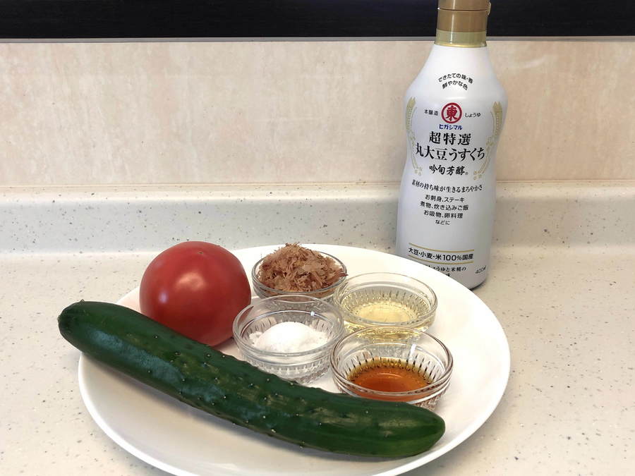 きゅうり1本は塩をまぶして板ずりし、青臭みを取りましょう。