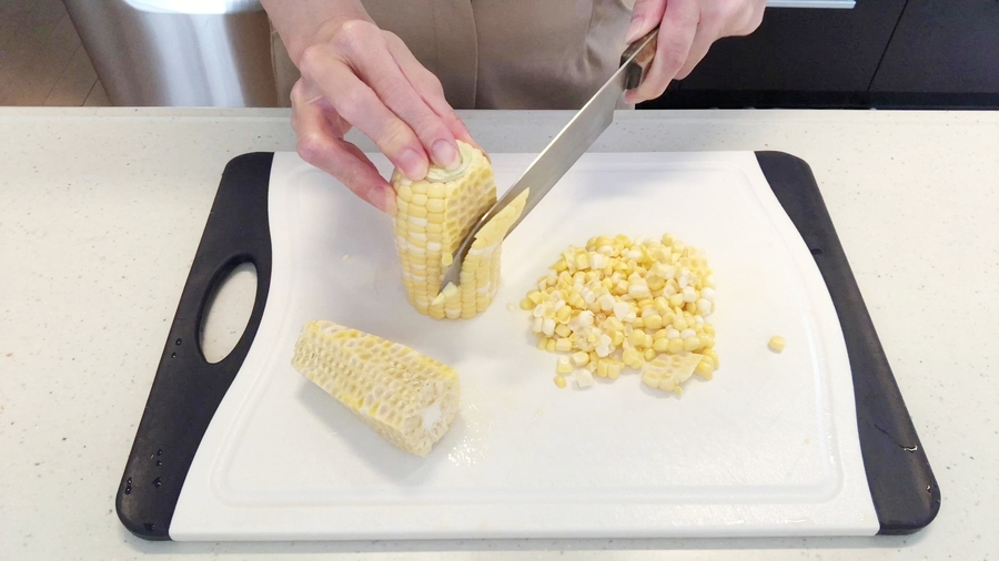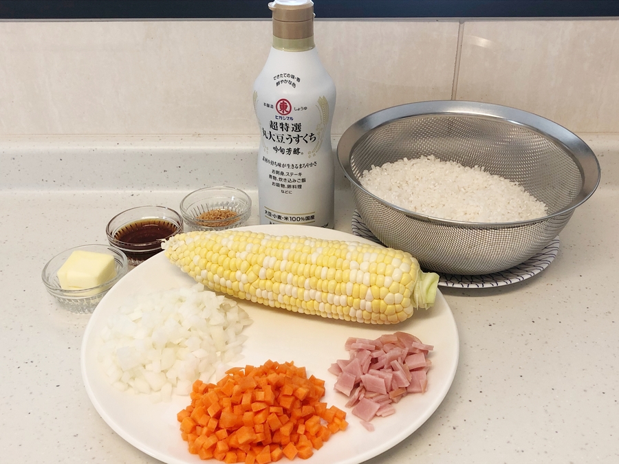 トウモロコシは粒をザザザーっと包丁でそぎ落とします。人参1/4本(50g)はあられ切り。玉ねぎ1/3個(80g)は粗みじん。ハム2枚は1センチ角に切ります。