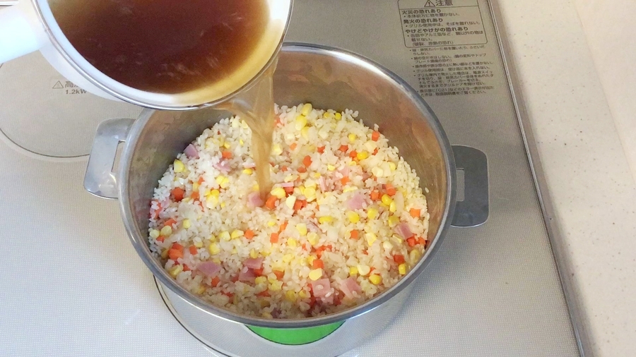 お米が透き通ってきたら、トウモロコシ、人参、玉ねぎ、ハムを入れ、もう1~2分炒めます。
