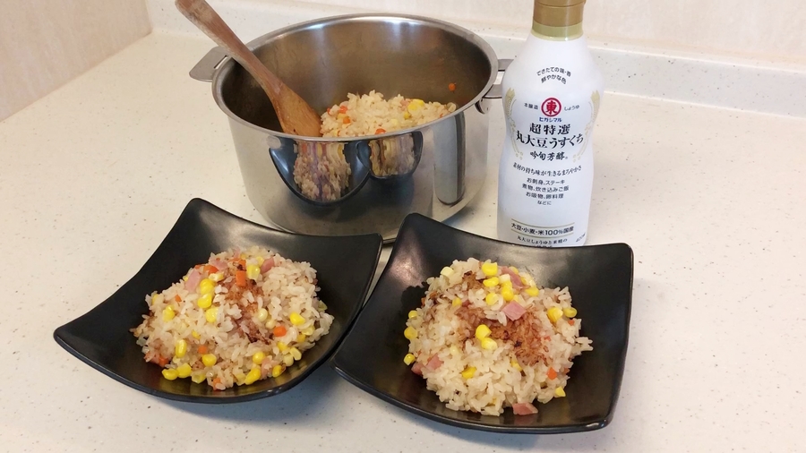 炊飯器で炊く場合は、具材、水、鶏がらスープの素、淡口醤油をすべて入れて炊きます。