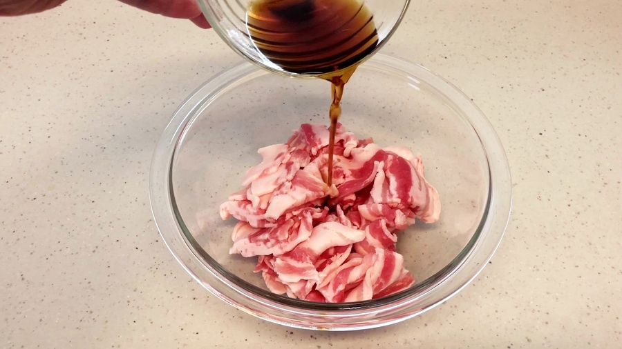豚バラ300gは3cm幅に切り、淡口醤油大さじ1、酒大さじ1、コショウ少々で下味をつけて、片栗粉をまぶしておきます。