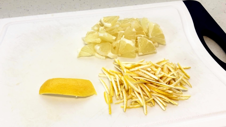 関先生「レモンの皮は薄くそぎ取って、千切りにしておくと、お料理上手って言われますよ」