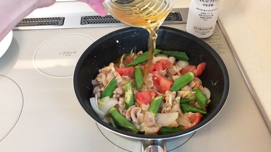 そこにレモン、トマト、オクラを入れてざっくり炒め合わせます。