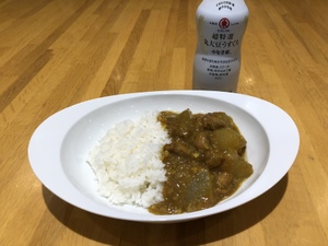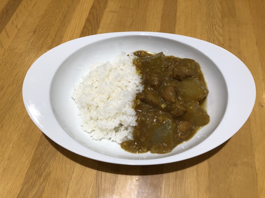 ⑤:④にカレー粉を振り入れ2分炒め、分量の水を加えて煮立てる。アクを取ってから鶏がらスープの素を入れ砂糖、酒、淡口醤油、冬瓜を入れ10分グツグツ煮る。
