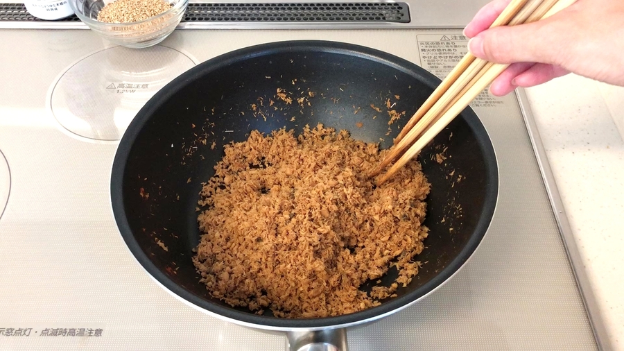 水分が減り、ちょっと煙が上がり始めてきたかなと思ったらいったん火を止めて、菜箸を使い余熱でパサパサパサっとほぐします。