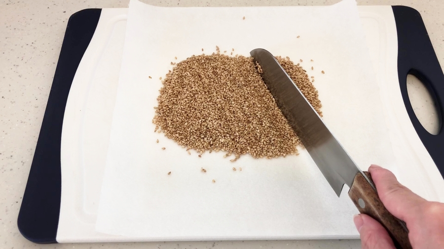 白いりごま1/4カップはもう一度炒り、キッチンペーパーの上にのせて包丁でザクザクザクっと切りましょう。