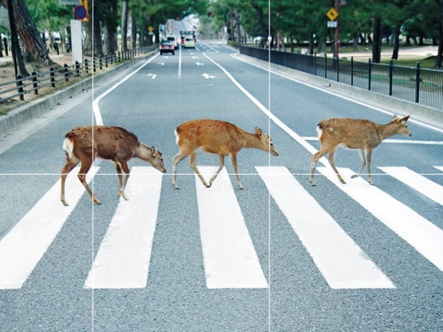 このポスターはかなりのインパクトです。人は写っておらず、三頭の鹿だけが横断歩道を左から右に悠々と渡って行っています。