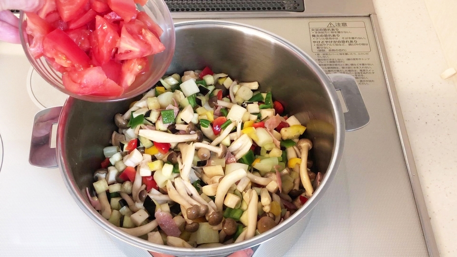 油が全体にまわったらトマトを入れて、大さじ1の水を加え煮立てましょう。