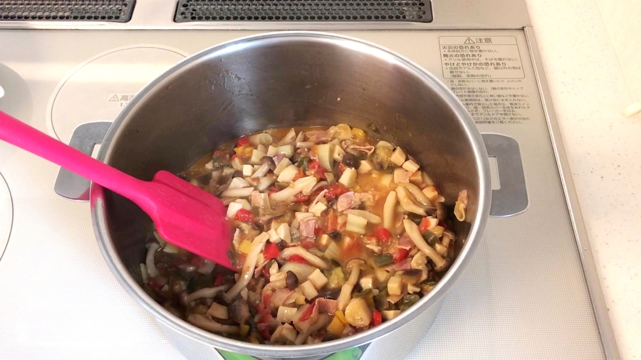 いい香りがしてきたな~と思ったら、ベーコンを加えて風味を出します。
