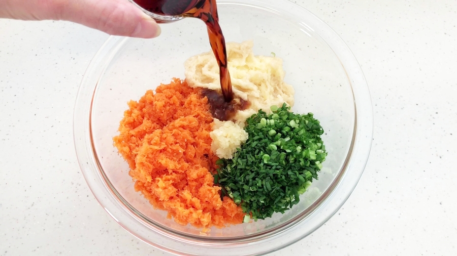ボウルにすりおろしたニンジン、ジャガイモ、ニンニク、ニラを入れて、淡口醤油大2とコショウを加え、全体を混ぜ合わせて5分置いてから水気を絞ります。