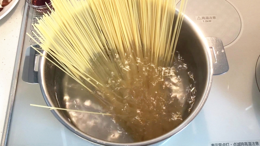 たっぷりの沸騰したお湯に控えめの塩を加えます。