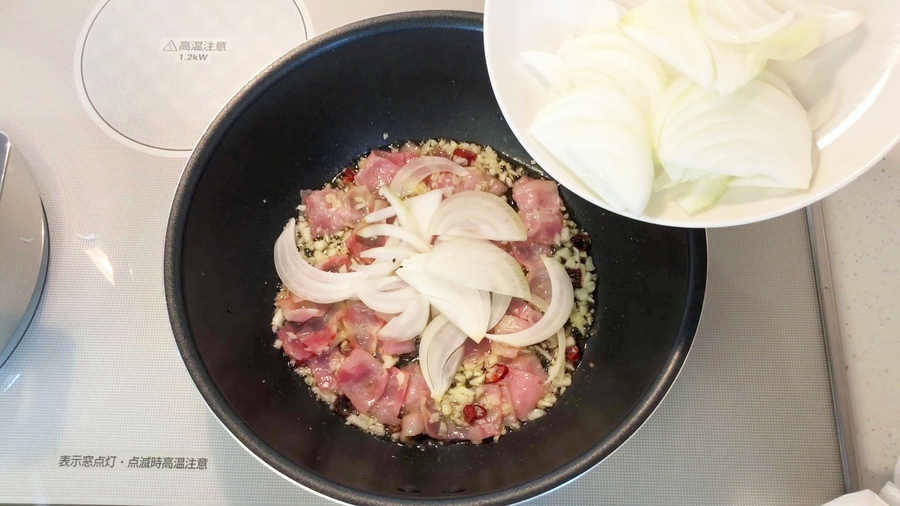 赤唐辛子が少し黒ずんできたらタマネギをさっと炒めましょう。