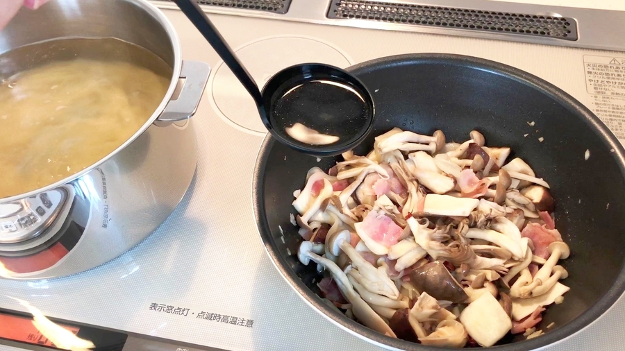 ここでバサーっときのこを入れ、ザックリと混ぜて油が行き渡ったら、スパゲッティの茹で汁1/4カップほどをきのこにまわしかけます。