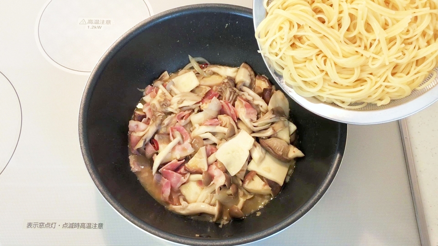 茹であがったスパゲッティをきのこの入ったフライパンに入れ、具材とからませます。