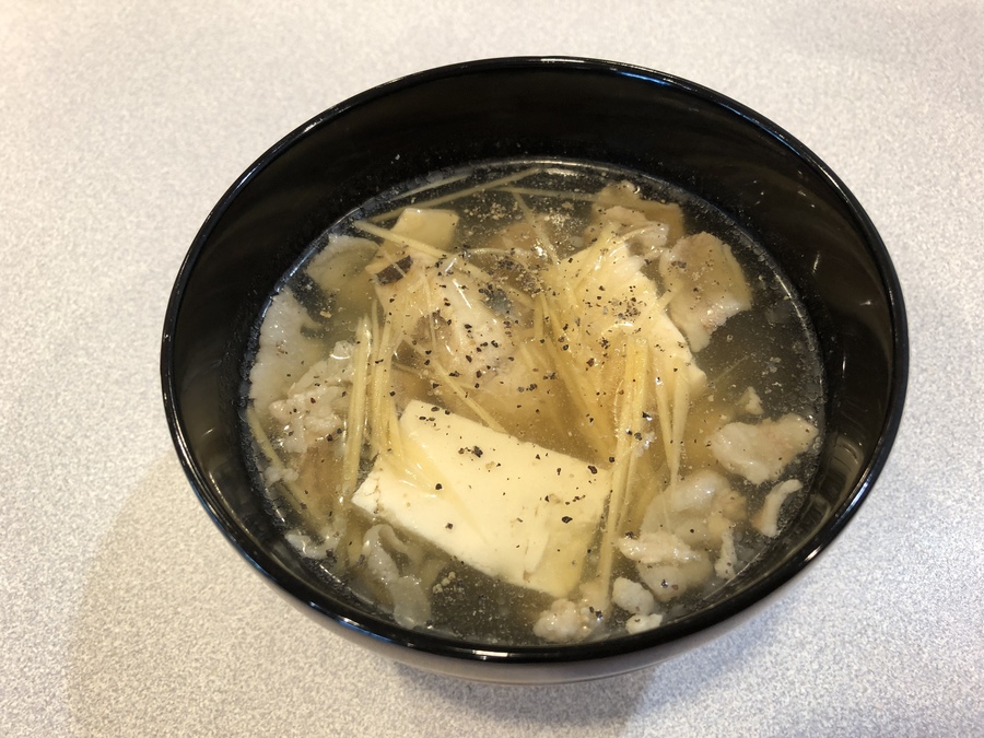 ⑥:生姜をたっぷり加えさっと混ぜ火を止める。お好みでコショウをふりかけて完成。