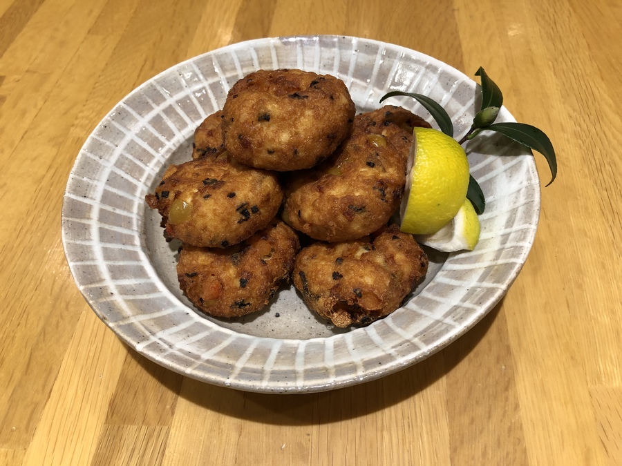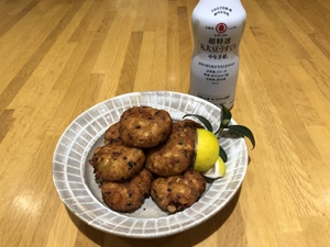 ⑥:フライパンに油を入れ弱火で3~4分焼き付け、その油はふき取る。新しい油を注ぎ、170度くらいの油で丸めた飛竜頭をきつね色に揚げる。