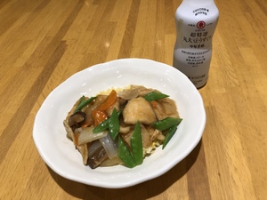 ⑥:水、鶏がらスープの素、淡口醤油、酒、みりん、砂糖、ごま油、コショウを合わせておく。水溶き片栗粉も用意しておく。