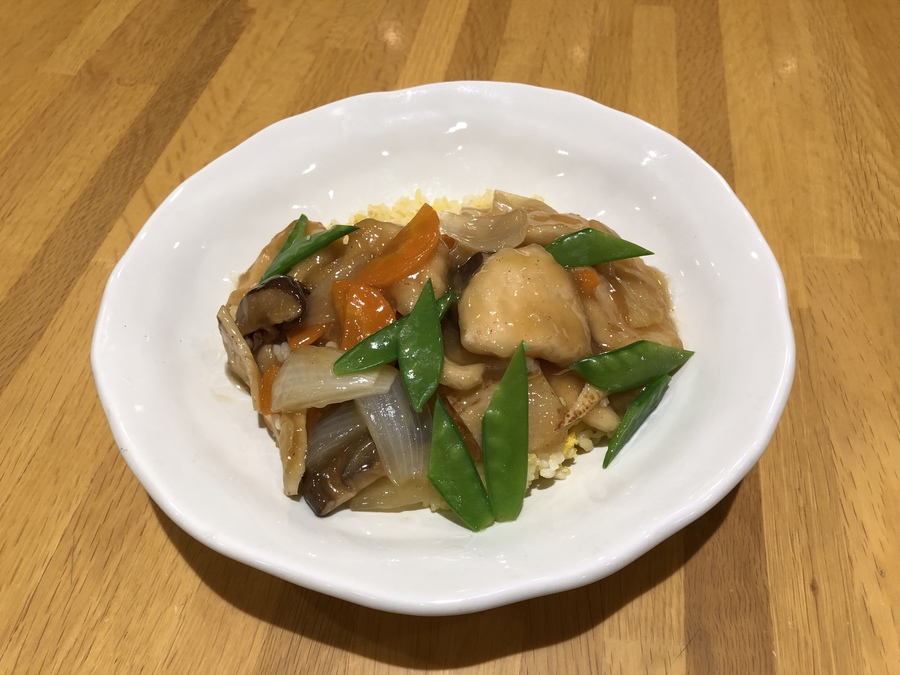 最後に、この卵かけチャーハンに作っておいた具材たっぷりのあんをかけ、茹でたサヤエンドウなどを散らして完成です。